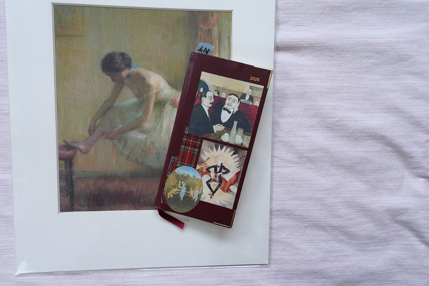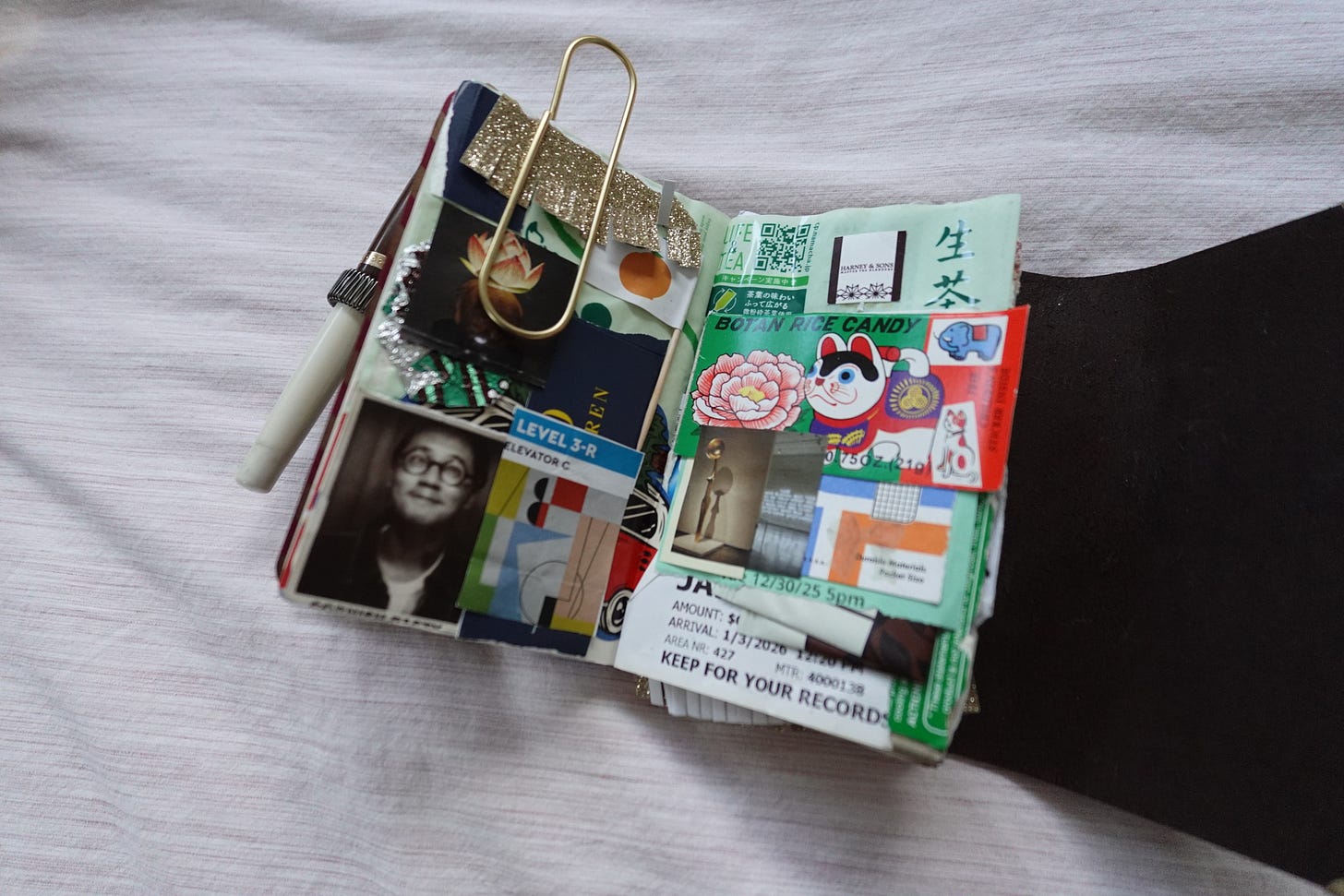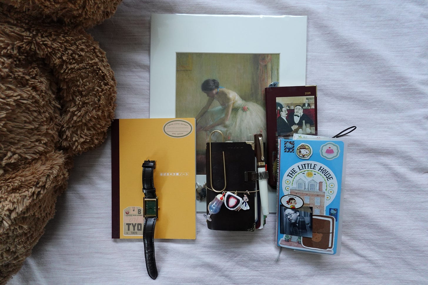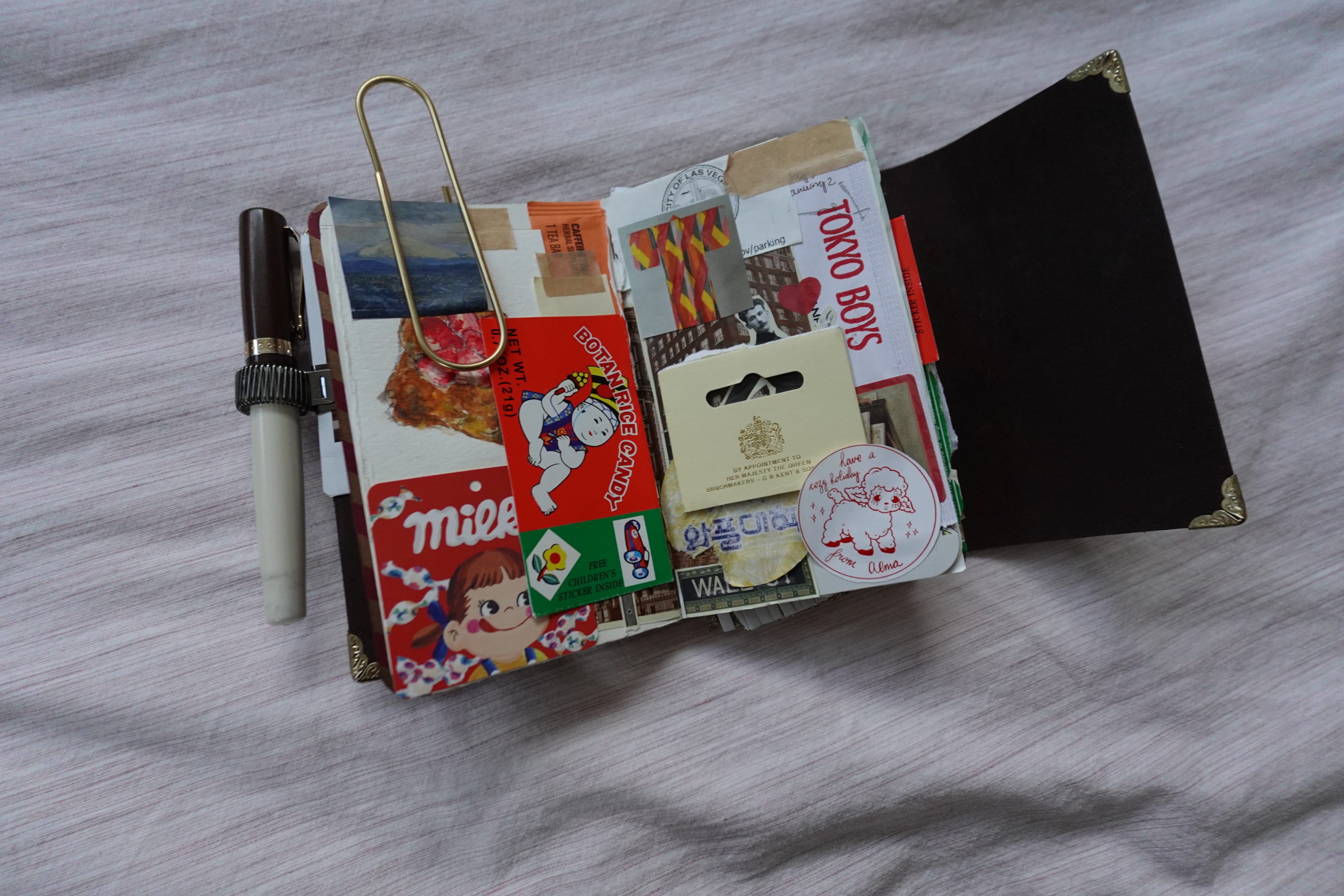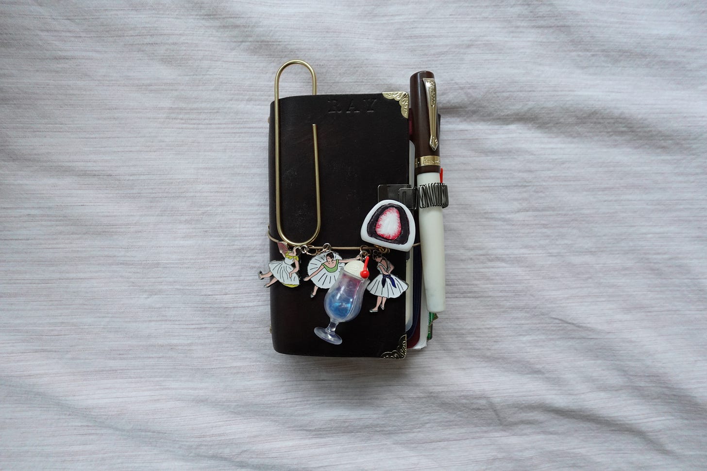 My junk journal. This is a pocket-sized leather tri-fold journal sleeve from Mira Kirumi that currently holds two journals inside. The cover is decorated with Edgar Degas inspired ballerina charms (A MET keychain that I turned into journal charms), A soda fountain charm from a gachapon, and a Ichigo Daifuku charm from Portland. The pen I use is the Kaweco Student Pen in Jazz.
