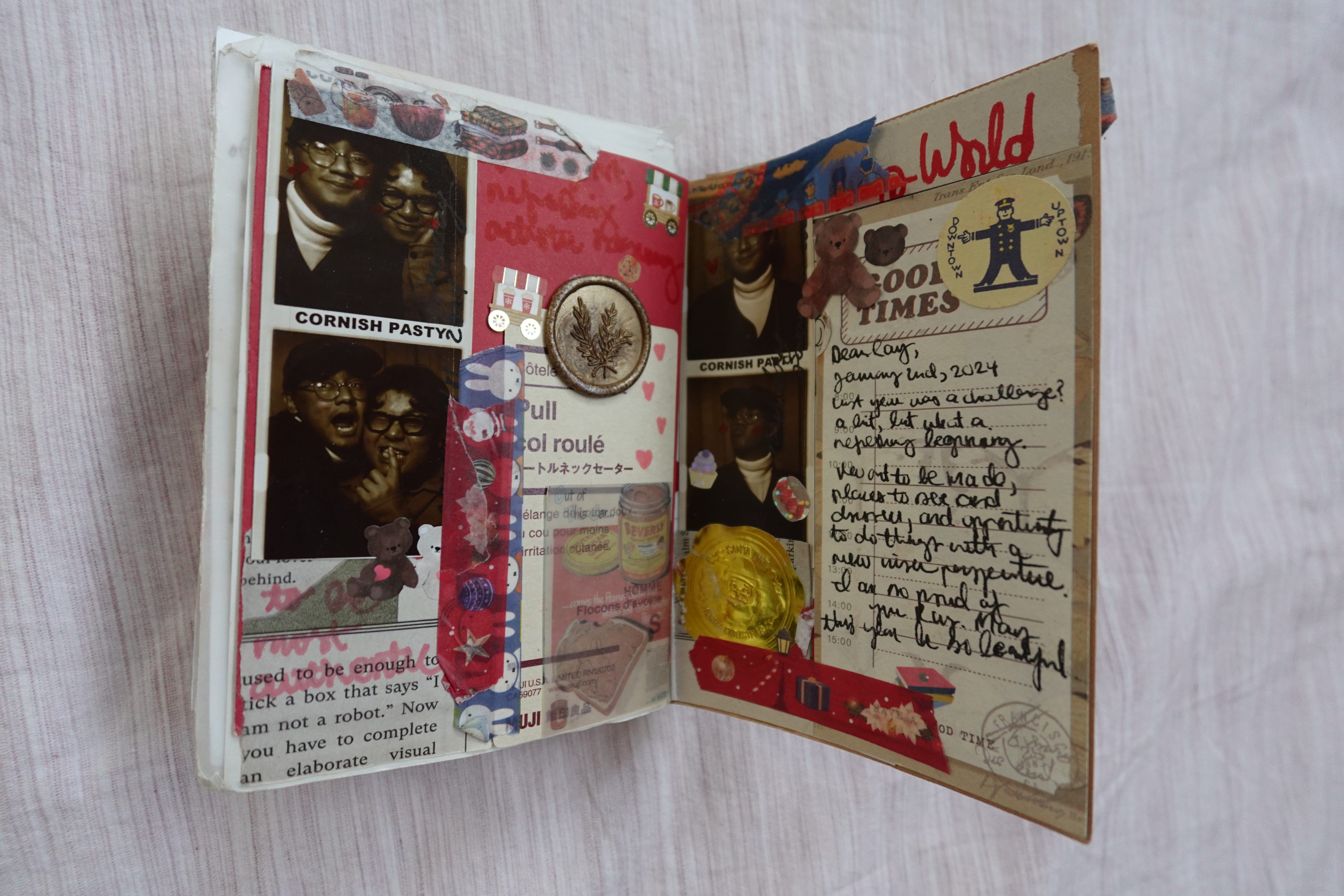 The inside of my junk journal. I admire the “lived in” look where my spreads look a bit chaotic yet eclectic. Though not much has changed with my journaling style compared to 2025, I am being more intentional about colors and mixed media. I learned that my favorite spreads of last year are those that play around with one to two colors throughout a spread. Here I am using a mix of red and continuously adding onto it. I’ll add in a photo of one of my favorites from 2025:
